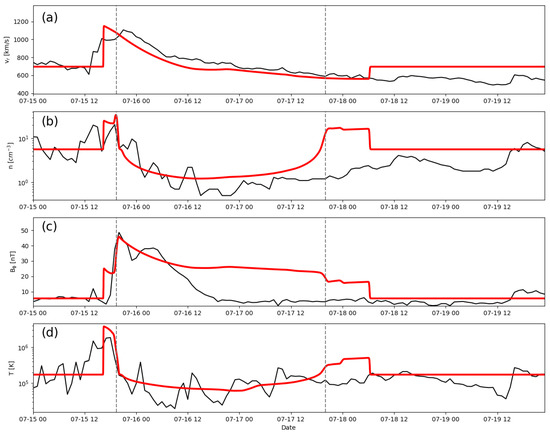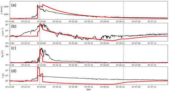 (a) Radial speed, (b) number density, (c) transverse magnetic field, and (d) temperature for event 1 (23 July 2012) are compared with in situ measurements at the location of STEREO-A. The dashed vertical lines mark the boundary of the ejecta material. Data (model results) are shown in black (red).