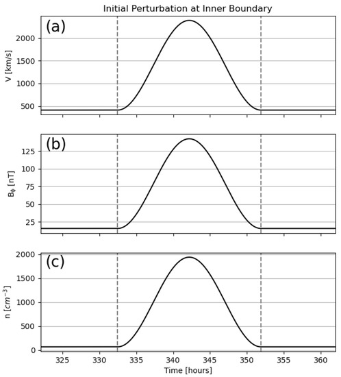 Boundary conditions for event 1 (23 July 2012): (a) radial speed, (b) transverse magnetic field, and (c) number density as a function of time. The dashed vertical lines mark the locations of two massless tracer particles inserted at the start and end of the pulse. Note that the ambient solar wind conditions were first established during the interval from h to h, at which point the pulse was inserted.