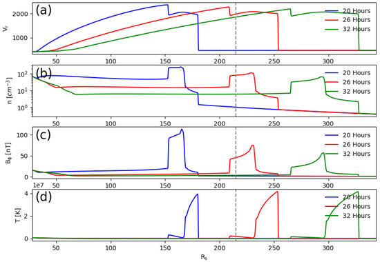 (a) Radial speed, (b) number density, (c) transverse magnetic field, and (d) temperature, for event 1 (23 July 2012) as a function of heliocentric distance at three snapshots in time, each separated by six hours. The red profiles correspond to the structures that would be seen in the vicinity of Earth, whose location is marked by the vertical dashed line.
