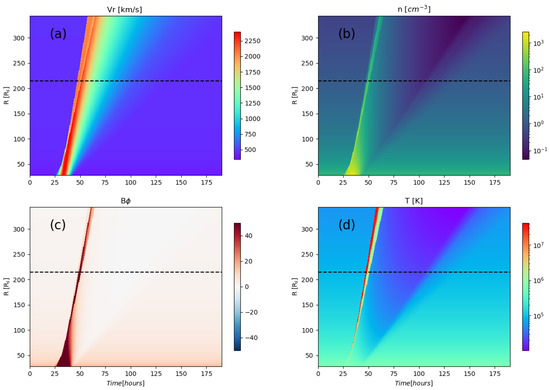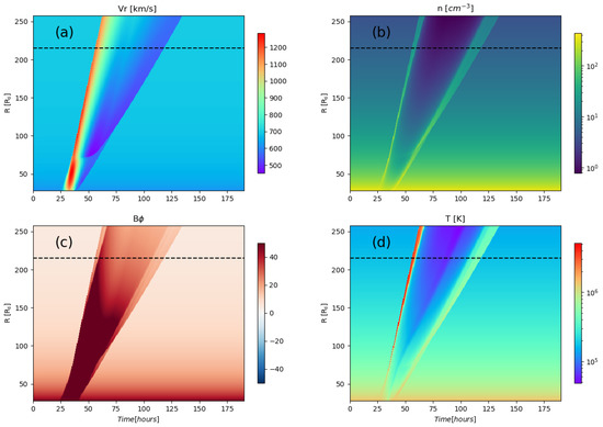 (a) Radial speed, (b) number density, (c) transverse magnetic field, and (d) temperature, for event 1 (23 July 2012). Each panel shows time along the x-axis and heliocentric distance along the y-axis. The dashed horizontal line marks the location of STEREO-A (1 AU).