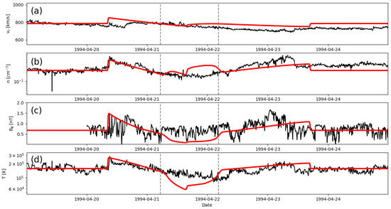 (a) Radial speed, (b) number density, (c) transverse magnetic field, and (d) temperature for event 2 (21 April 1994) are compared with in-situ measurements at the location of Ulysses (3.2 AU). The dashed vertical lines mark the boundary of the ejecta material. Data (model results) are shown in black (red).