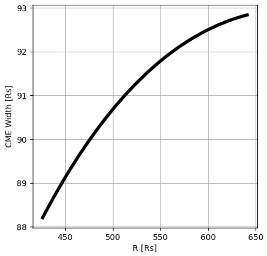 We can investigate the expansion of the ICME by following the difference in location of the tracer particles at the leading and trailing edges of the ICME. This is shown in Figure 4. Interestingly, in this case, the ICME maintains a constant expansion with respect to distance from the Sun, at least in the range from ∼90 RS to ∼130 RS. Since the simulation’s inner/outer boundary was set at 30 RS/1.2 AU, only the interval where both boundaries are within the simulation domain are shown. This profile is not surprising for such an extreme event, which moves rapidly through the solar wind. Thus, it arrives at 1 AU remarkably quickly and is thus relatively “unevolved”, at least in terms of the pressure gradients acting on the ejecta itself.