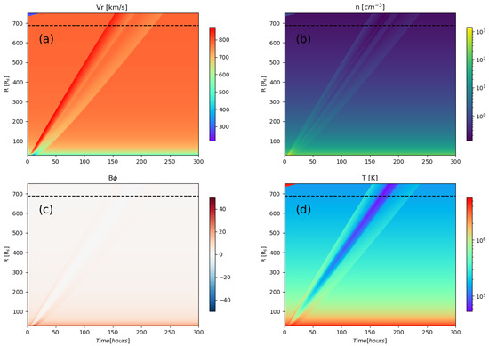 (a) Radial speed, (b) number density, (c) transverse magnetic field, and (d) temperature, for event 3 (14 July 2000). Each panel shows time along the x-axis and heliocentric distance along the y-axis. The dashed horizontal line marks the location of ACE/WIND (1 AU).