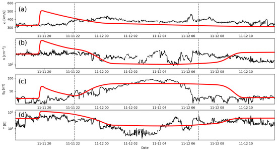 (a) Radial speed, (b) number density, (c) transverse magnetic field, and (d) temperature for event 4 (11 November 2018) are compared with in situ measurements at the location of PSP. The dashed vertical lines mark the boundary of the ejecta material. Data (model results) are shown in black (red).