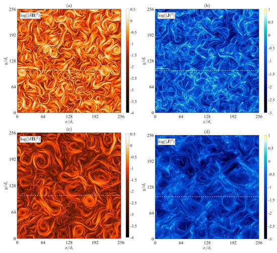 Contour plots of the logarithm of the magnitude of the magnetic fluctuations, , and of the current density, , for Run 1 ((a,b), respectively) and for Run 2 ((c,d), respectively), at their respective time of maximum turbulent activity. The white horizontal dotted lines mark 1D cuts that we analyse in Figure 2 and Figure 3.