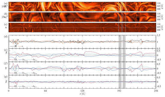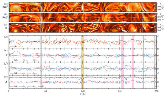 The three gray-shaded areas in panels (d)–(g) highlight regions where the fluctuations are highly Alfvénic, as , with . Looking back to panel (a), we can easily identify these as intense filamentary magnetic structures, with a width of the order of , which have formed between large vortices. As we mentioned regarding Figure 1, these are regions where the magnetic field lines at the borders of interacting vortices have the same direction, so reconnection cannot occur. It is therefore reasonable to assume that, under these circumstances, the frozen-in condition holds, which is why, in these structures, we observe a strong coupling between magnetic field and ion bulk velocity fluctuations. In panel (d), we observe that the variations of and n occur on short length scales, of the order of the ion inertial length, and they typically seem anti-correlated, so that increases in the former correspond to decreases in the latter and vice versa, although there is not a perfect correspondence and the levels of the two are different, which can be linked to fact that the plasma beta is different from 1. It is reasonable to speculate that the anti-correlation between the two quantities is related to the balance between magnetic and particles’ thermal pressure, so that when one decreases, the other one has to increase and vice versa. There are, however, two pink-shaded regions where we observe a direct correlation instead, as . These regions are as large as a few times , and panel (a) shows that they correspond to the centres of large-scale vortices. In this case, the pressure balance cannot hold as the fluctuations of both quantities are positive with respect to their mean values. We can explain this by considering the Faraday–Ohm equation in the Hall-MHD approximation, which, when written for , reads , and reads , where (cf. [48] for the ideal MHD case where ).