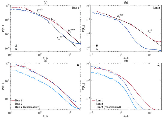 Spectral properties of the magnetic field and ion bulk velocity fluctuations: (a) power spectra of and for Run 1 with reference power laws superimposed; (b) same as panel (a) but for Run 2; (c) direct comparison of the magnetic field spectrum of Run 1 and Run 2, with the latter also renormalised by a factor that “corrects” for the lower initial magnetic fluctuations and the slightly larger injection scale (so that the spectra of the two simulations coincide at ); (d) same as panel (c) but for the ion bulk velocity.