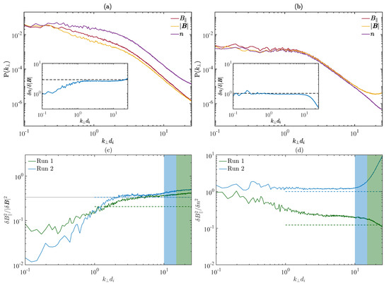 It is also interesting to compare the magnetic compressibility, , which is shown in Figure 5. In particular, in panel (a) and (b), we show the power spectra of the parallel magnetic fluctuations with respect to the guide field, , of the magnitude of the magnetic field, , and of the density, n, for Run 1 and Run 2, respectively. Figure 5a shows that, for Run 1, the approximation is quite good below the ion-scale break, while it is worse at larger scales. This is in agreement with the fact that the ratio in Equation (5) is minimum around the injection scale and it monotonically increases with decreasing scale, reaching a value of 10 at approximately the scale of the break (not shown here). In the inset, we show the ratio , which is constant for and very close to the prediction from Equation (4), with c negligible, which is marked by the black dashed horizontal line. It is worth noting that the ratio is constant only at sub-ion scales, while it is scale-dependent at larger scales. This could explain why we could not see a clear behaviour in the 1D cuts of the simulation domain shown in Figure 2. Figure 5b shows that, for Run 2, instead, the approximation is very good for and until the noise level is reached, in agreement with the fact that the ratio in Equation (5) reaches 10 already at . In this case, the fluctuations of n, , and appear to be strongly coupled, since , and such coupling holds at all scales above the noise level. This explains why we could observe a clear anti-correlation between and n in the 1D cuts shown in Figure 3. In Figure 5c, we directly compare the magnetic compressibility of the two simulations with the theoretical prediction [57,58], where is the total plasma beta, as we have also recently done in Matteini et al. [59]. Such prediction, which is valid for kinetic Alfvèn waves (KAWs), is expected to hold, more in general, for low-frequency magnetic structures in pressure balance at those scales where the ion bulk velocity becomes negligible with respect to the electron one. Interestingly, the two simulations exhibit a comparable value of the magnetic compressibility at sub-ion scales, with a small shift in the scale at which a plateau is reached. Such shift is compatible with what we have found in Matteini et al. [59], where we have observed that such scale depends on the ion plasma beta, being smaller for larger betas. While the level is comparable to the theoretical prediction for Run 2, it is not for Run 1. It seems that, for both simulations, the level of magnetic compressibility sets to , which corresponds to isotropy between the three magnetic field components. Finally, in Figure 5d, we compare the ratio for the two simulations with the theoretical prediction for KAWs. This can be rewritten as and it also corresponds to the prediction for magnetic structures in pressure balance in the presence of small turbulent fluctuations (cf. Equation (4)). While, for Run 2, the ratio almost coincides with the prediction, for Run 1, instead, we obtain an excess. We speculate that this could be related to the larger level of initial fluctuation, which affects the validity of our assumptions, as already discussed in regard to Figure 5a. It is important to note, however, that, for Run 1, the ratio is only less than a factor of 2 larger than the prediction, meaning that the ratio is still of the order of 1.