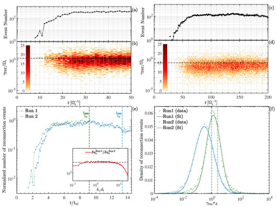 Figure 6a,c show the time evolution of the number of reconnection events during Run 1 and Run 2, respectively, up to the time when they reach a fully developed turbulent state. The overall evolution in both simulations is similar and qualitatively the same as the one reported in [60]. Firstly, we note that the number of reconnection events is different in the two simulations. This is a consequence of the different injection scale and of the different plasma conditions, which, as we have noticed in Section 3.1, determine the different filling factors of magnetic vortices. This leads to a different number of regions where vortices interact and hence to a different number of formed current sheets. Magnetic reconnection starts to occur early in both simulations, with the number of reconnection events growing until it reaches a more or less constant plateau, i.e., a balance is achieved between current sheets disrupting and new ones forming. Figure 6b,d show the distribution of the reconnection rates for all events at all times. The distribution of the reconnection rates for Run 1 is shifted toward higher values than for Run 2 by roughly one order of magnitude, with an average reconnection rate and for Run 1 and Run 2, respectively. Therefore, it is reasonable to ask whether this is the indication of the existence of two different regimes of turbulence-mediated reconnection in the two runs or it is instead the same regime but occurring under different turbulence conditions. To further investigate this aspect, in Figure 6e, we compare the temporal evolution of the number of reconnection events in the two simulations, by putting together panels (a) and (c). To correct for the different number of events in the two simulations, here, we have renormalised the number of events by their respective maximum values during the evolution. Moreover, since we know that magnetic reconnection takes place in current sheets that form and shrink between magnetic vortices and that the first current sheets form between the largest vortices, we have also renormalised the evolution time by the nonlinear time of the large-scale magnetic vortices (the so-called eddy turnover time), as this is the characteristic timescale of turbulence regardless of the different initial conditions that may be set, e.g., [61]. For the nonlinear time, we adopt the definition , where is the amplitude of the electron bulk velocity fluctuations at the injection scale. This yields and . The time evolution in units of is very similar for the two simulations: they both develop the first reconnection events after approximately and reach the maximum turbulent activity after a few times this value. This is consistent with our previous results [45,60,62], and further confirms a posteriori that the driver of reconnection is the turbulence, via the interaction of magnetic vortices, and so the eddy turnover time also acts as the “characteristic clock” for the formation of current sheets, which then undergo reconnection.