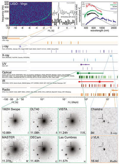 GW170817 was followed by GRB 170817A [6], a short gamma-ray burst (GRB) detected independently by the Fermi Gamma-ray Burst Monitor [7], and the Anti-Coincidence Shield for the Spectrometer for the International Gamma-Ray Astrophysics Laboratory (INTEGRAL) [8]. The initial LIGO-Virgo sky-localization of GW170817 had an area of about 30 deg2 and an extensive follow-up observing campaign was launched throughout the electromagnetic spectrum [9]. Within ∼11 h from the merger of the BNS source of GW170817, multiple teams independently detected a transient source in the optical/near-infrared bands, AT2017gfo, in NGC 4993, a galaxy at a distance compatible with the one obtained from the GW data analysis, ∼40 Mpc, and contained within the 90% confidence sky-localization area of GW170817 (e.g., [10] and references therein). The transient source resulted to be consistent with a kilonova (e.g., [11,12]). Already predicted since the 1970s [13,14], the term “kilonova” indicates an emission component ∼1000 times brighter than a nova. Kilonova radiation is powered by the radioactive decay of heavy unstable isotopes, the nucleosynthesis of which invokes rapid neutron capture processes allowed in core-collapse supernovae but also in the neutron-rich environment generated after the merger of two NSs. The observations that followed targeted AT2017gfo and its environment, unveiling emission across the whole electromagnetic spectrum. The totality of the GW and electromagnetic observations, including the untargetted detection of GRB 170817A, constitute the first multi-messenger observation with GWs (Figure 1).
