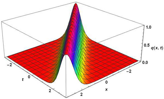 www.wolfram.com/solutions/industry/software-engineering/, accessed on 20 June, 2022), show the surface plots of a bright 1-soliton (2) to the mathematical model Equation (1) for