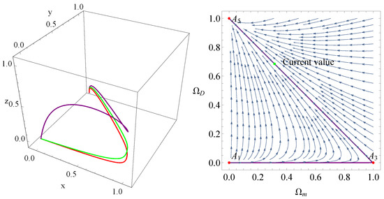Point and : These points are determined by and . For the small value of , they represent the dark energy-dominated era with an accelerated phase.