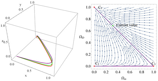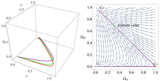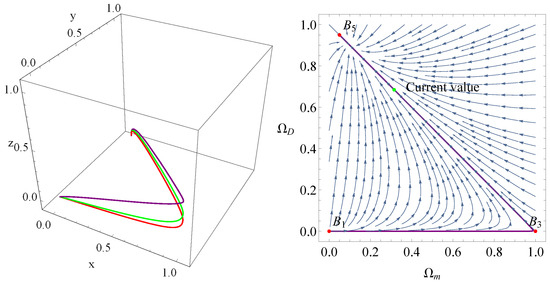 Using the linear stability theory and after some tedious calculations. We give the corresponding eigenvalues and stability conditions in Table 1. From this table, we can see that the radiation-dominated point is unstable, the dark energy-dominated point is stable, and the rest points are saddle points. According to this result, the universe stems from the radiation-dominated era , followed by the matter-dominated era , and eventually evolves into an accelerated expansion epoch . This evolutionary case is shown in Figure 1 in which we have plotted the evolutionary trajectories of these points. From this figure, we can see that point behaves as an attractor, and the universe will eventually evolve into an epoch depicted by the cosmological constant.