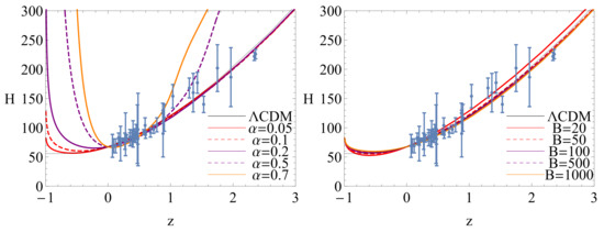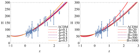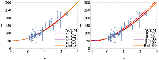 In order to discuss the difference of cosmological evolution between BADE and CDM, we have plotted the evolutionary curves of Hubble parameter for these models in Figure 5, Figure 6 and Figure 7. The error bars in these figures denote the observational Hubble parameter data [73,74]. In Figure 5, we have plotted the evolutionary curves of the Hubble parameter for the non-interacting case . The left panel shows the evolutionary curves of the Hubble parameter in BADE, and the curves approach the one in CDM with a small . In the right panel, for a large value of B, these curves in BADE overlap with the one in CDM. For the interacting case , the evolutionary curves deviate from the one in CDM in the future which is shown in both the left and right panel of Figure 6. The evolutionary curves of Hubble parameter for the interacting case are plotted in Figure 7. The left panel of Figure 7 shows that the value of has a slight influence on the evolutionary curves of the Hubble parameter. The right panel of Figure 7 shows the same results as the right panel of Figure 5. Thus, for the non-interacting case and the interacting case with , BADE can mimic the cosmological constant in the late-time evolution epoch.