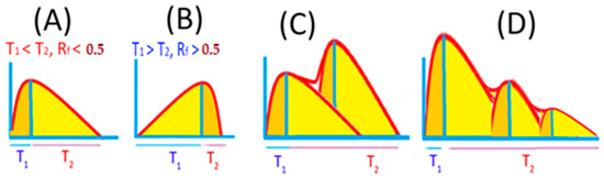 Schematic diagrams exhibit the time profiles of the two types of flares, sudden and gradual flares. As well as these have multiple and complex peaks. The X-axis represents the time. It splits into two intervals, T1 and T2, which are corresponding to the rising and falling intervals respectively. The Y-axis is the flare’s X-ray flux or count rate. (A) denotes the case of the sudden flare. While (B) denotes the case of the gradual flare. (C,D) refer to the flares of multiple peaks. However, (C) is considered a gradual flare. Whereas (D) is considered a sudden flare.