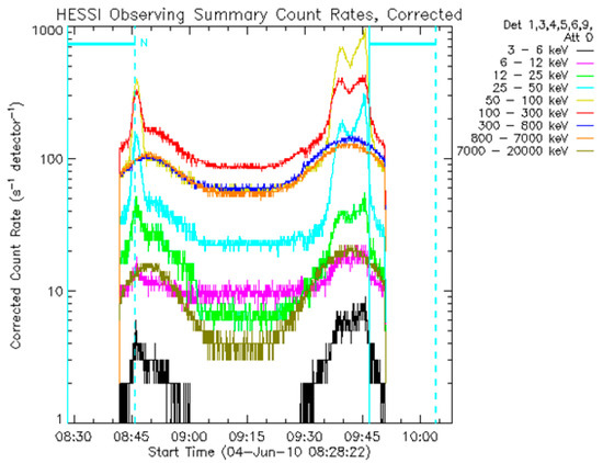 An example of both sudden and gradual solar flares was detected in RHESSI on 4 June 2010. The figure was extracted from (https://sprg.ssl.berkeley.edu/~tohban/browser/, accessed on 20 July 2022). Our two cases of flares appear more clearly in the RHESSI solar flares that are shown in the black, burble, and green lines.