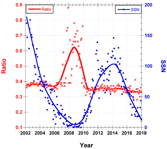 The relationship between the ratio index and solar activity was based on the inverse correlation between the monthly mean ratio index and that of SSN, which represents solar activity.