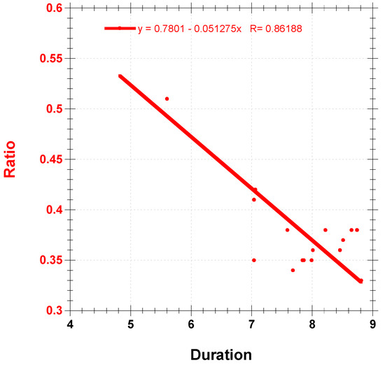 Suppressed sudden flares are considered to be evolving in longer loops so that the decay time is longer than the rising time, and this is compatible with [30], who concluded that the events with longer decay times should have a larger separation of flare ribbons, i.e., evolve in longer loops. In other words, the longer decay time flares, sudden flares according to our criteria, are large. Whereas the gradual flares, having short decay times, are small ones. Figure 4 confirms the prior interpretation since it shows the duration is inversely dependent on the flare’s ratio index. The gradual flares that increased during the years of low activity, 2008 and 2009, are typical of short duration.