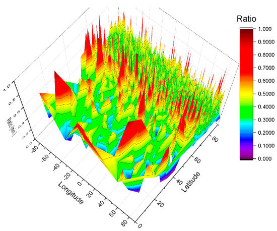 The heliographical distribution of the flare’s ratio index has been examined during the current period of study (2002–2018). To a large extent, the flare’s ratio index depends on its heliographical location as shown in Figure 5. The gradual flares tend to be highly concentrated within about ±(50°–70°) of latitude. While sudden flares are more prevalent in polar locations or at high latitudes ±(80°–90°). In addition, the equatorial region is characterized by the existence of both types. Further, there is no clear correlation with the longitudes.