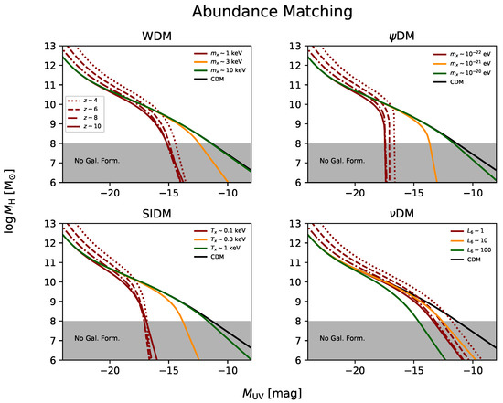 - Menci, N.; Grazian, A.; Lamastra, A.; Calura, F.; Castellano, M.; Santini, P. Galaxy Formation in Sterile Neutrino Dark Matter Models. Astrophys. J. 2018, 854, 1. [Google Scholar] [CrossRef]