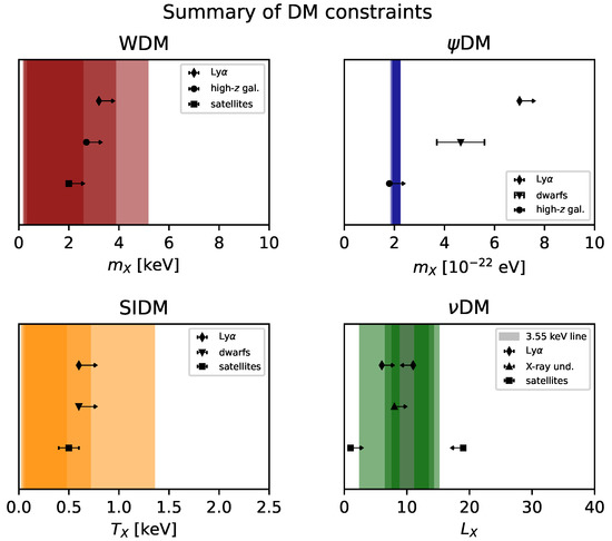 - Newton, O.; Leo, M.; Cautun, M.; Jenkins, A.; Frenk, C.S.; Lovell, M.R.; Helly, J.C.; Benson, A.J.; Cole, S. Constraints on the properties of warm dark matter using the satellite galaxies of the Milky Way. J. Cosmol. Astropart. Phys. 2021, 2021, 062. [Google Scholar] [CrossRef]