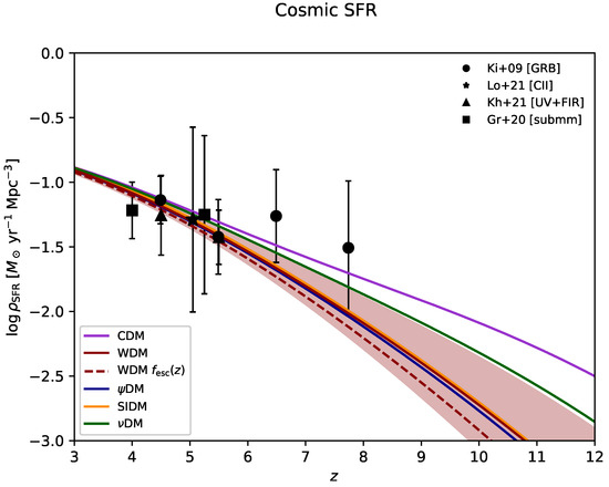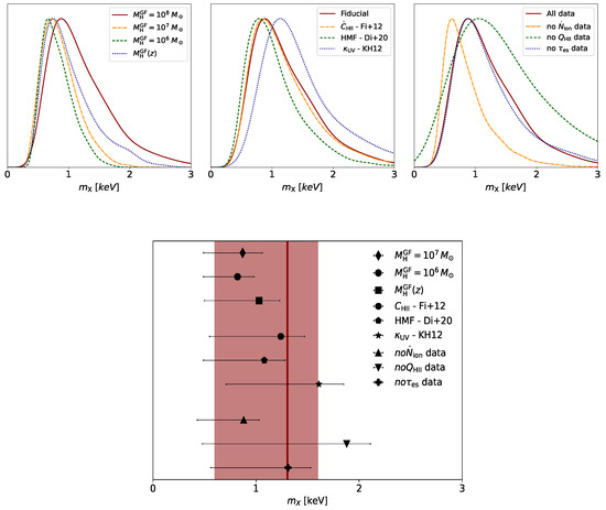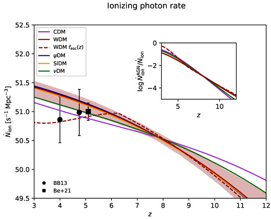 - Dayal, P.; Choudhury, T.R.; Bromm, V.; Pacucci, F. Reionization and Galaxy Formation in Warm Dark Matter Cosmologies. Astrophys. J. 2017, 836, 16. [Google Scholar] [CrossRef]