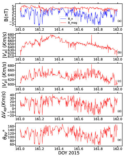 Illustration of typical parameters of a fast wind interval at 1 au using WIND data from 10 June 2015. Panel (a) shows the magnitude of the magnetic field and the component; Panel (b) shows the alpha bulk speed; Panel (c) shows the proton bulk speed; Panel (d) shows the difference between the alpha and proton bulk speed; and Panel (e) shows the angle between the B and V vectors.