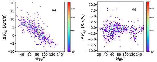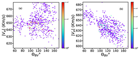 2D histogram plot of (a) alpha bulk speed () and (b) proton bulk speed () vs. for the fast wind interval shown in Figure 1. The time of the interval is 10 June 2015. The color bar represents the number of counts.