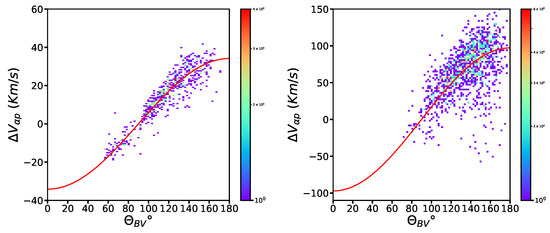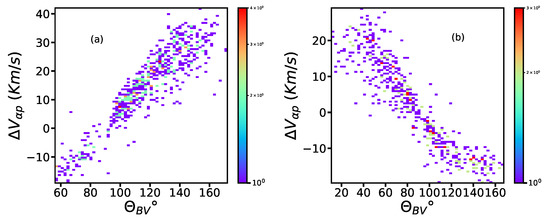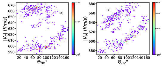 In Figure 2, we plot a 2D histogram plot of the vs. and vs using the same data of the fast solar wind stream shown in Figure 1. Figure 2a shows that there is no correlation between the and . Figure 2b shows that there is a nice anti-correlation between and . Similar behavior has been observed in different works, e.g., Matteini et al. [19,20], where the authors show that in the fast wind streams there is a clear correlation and anti-correlation between and depending on the polarity. It has been suggested that the reason for the nice correlation/anti-correlation due to the Alfvénicity of the wind is that Alfvénic fluctuations control the speed of the protons.