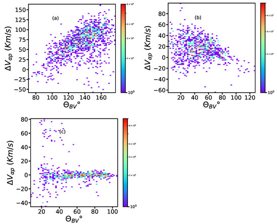 Our studies at 1 au show that there is good correlation/anti-correlation between and in the fast wind and slow Alfvénic wind intervals. There is no correlation for the case of slow non-Alfvénic wind. Similarly, analysis of the intervals in the inner-heliosphere between 0.3 to 1 au shows the same behavior. We observed good correlation/anti-correlation between and in the fast and slow Alfvénic wind intervals, and no correlation in the case of the slow non-Alfvénic wind. The reason for these observations is that alphas are expected to not respond to the magnetic field oscillations; instead, they “surf” the large amplitude fluctuations in the solar wind [9,20,21]. On the other hand, protons are affected by large-amplitude magnetic field fluctuations; depending on their polarity, they show a nice correlation/anti-correlation between and , as shown in the studies of Matteini et al. [19,20].