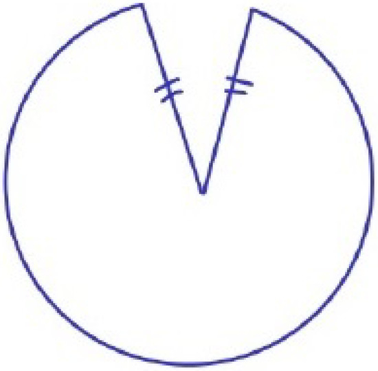 A flat sheet with a wedge cut out of it and the wedge’s sides identified. Here it is drawn circular, but this does not matter.