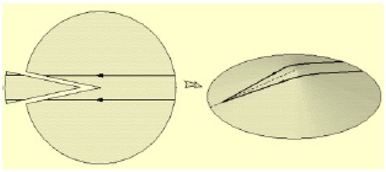Now, let us consider the PNDP deprived of the point , where are the coordinates of the point. Then, (note that is similar to consider ), and the missing point is the “fragility” place of the PNDP manifold. If the attached string strongly interacts (also here, as seen in [17], the authors’ approach considers the emergent parts of the PNDP manifolds as topologically equivalent to open or closed strings), that is, it vibrates, then from the “puncture” (missing point) the underlying manifold “splits”, creating a missing sector with an arbitrary small angle, i.e., a wedge is cut out of it. However, being a topological approach, it seems entirely sensible to us to require that nature wants to maintain the topological equivalence between the underlying manifolds that make up the D-brane, i.e., (at least) a homeomorphism that preserves the topological properties between them, dealing with differentiable manifolds, we will consider diffeomorphism. Therefore, the sides of the wedge will glue together, creating a conical defect without a vertex (this is illustrated in Figure 3), and it is well-known that there is a homeomorphism between and the cone without its vertex; for example, as subsets of , there is a diffeomorphism in the most intuitive way: ). With this imposition, the differentiable structure of is carried to the cone, and as we said at the end of the previous section, this allows us to consider that some , which have the conical defect, have a non-zero holonomy.