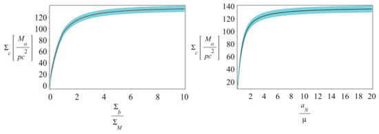while the dimensionless MOND acceleration ratio, in a similar way as in [47], reads (with , the baryonic surface density, approximated by an integrated constant volume density )