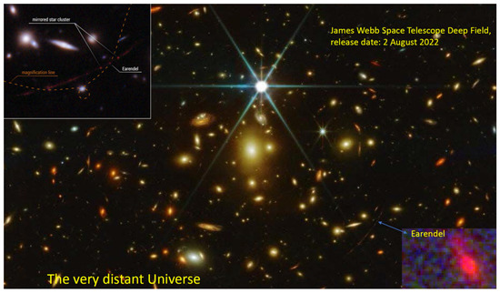 However, the Universe, as a whole, was still pretty dark for a long time after recombination. The expansion was constantly enlarging it, and there were still no objects of great luminosity around, apart from the faint background radiation. The Cosmos only truly lit up when the first young stars began to shine, some 300 million years after its birth. The early stars, and perhaps some other sources as yet little-known, or still to be discovered (remote objects that no one had counted on previously, are continually turning up in cosmos research), blasted enough radiation into Space to separate, again, most of the hydrogen atoms present in its constituent protons and electrons. Earendel is one of the most distant stars that have been observed from that time (Figure 5).