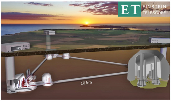 As far as observations of the Cosmos are concerned, it is expected that ESA’s Euclid mission, which will be launched in 2023 (Figure 7) and, a decade later, in the 2030’s, the Einstein Telescope of gravitational waves (ET Project, Figure 8), the LISA mission, as well as a handful other projects, will help us advance in an understanding of the nature of the dark side of the Universe, namely dark energy, dark matter, black holes, as well as in resolving the other great unknowns already mentioned, and which still remain open for a comprehensive knowledge of the Cosmos [39,40,41,42,43,44,45,46].