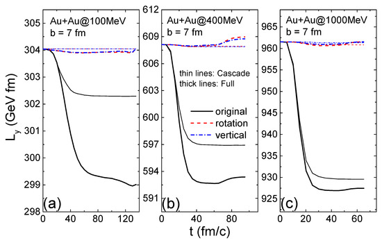 We then move to simulations of non-central Au+Au collisions and compare the total angular momentum from three collision prescriptions at different collision energies in Figure 3. In the Cascade mode with only elastic and inelastic collisions as well as Pauli blockings, the angular momentum perpendicular to the reaction plane is exactly conserved for the “rotation” and “vertical” prescriptions at 100 AMeV and slightly violated at higher collision energies. The latter is due to the difficulty of conserving the angular momentum in the channel without incorporating spin degree of freedom, as mentioned before. The violation becomes even larger after incorporating the mean-field potential in the Full-mode calculation, but after all the violations are at the level. Incorporating the Coulomb potential between point-charged particles in the present study always conserves the angular momentum. For the “original” collision prescription, although the angular momentum violation in one collision may cancel with that in another collision, the violation of the total angular momentum is much larger ( at higher collision energies) compared to the “rotation” and “vertical” prescriptions. The violation of the total angular momentum in the “original” collision prescription is mostly due to nucleon–nucleon collisions at 400 and 1000 AMeV but is seen to be much enhanced by the mean-field interaction at 100 AMeV.