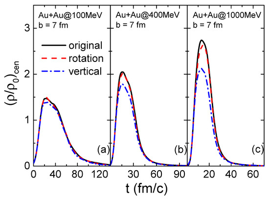 Figure 5 compares the central density evolution from three collision prescriptions in non-central Au+Au collisions at different collision energies. As shown in Figure 2, in-plane collisions, i.e., without changing the azimuthal angle after collisions, generally lead to a larger average distance between nucleons, thus a faster expansion of the system and a lower density. For the “rotation” prescription, the coordinates of the colliding particles are effectively pulled back a little after collisions, so this prescription leads to a slower expansion and a higher density compared to the “vertical” prescription, which happens to result in a central density evolution closer to that from the “original” prescription.