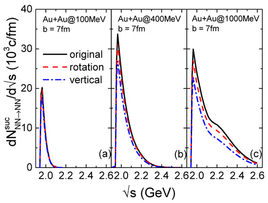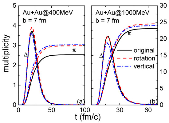 Figure 9 compares the time evolutions of the and pion multiplicities from three collision prescriptions at different collision energies. The peak values of the multiplicities in the three collision prescriptions are consistent with their maximum densities as shown in Figure 5. Compared with the “original” prescription, both channels of and are suppressed in the “vertical” prescription due to the larger as shown in Figure 2b. Since the in the channel is farther from the nucleon in the “vertical” prescription compared to the “original” prescription, the has a larger chance to decay. Therefore, the “vertical” prescription leads to a pion multiplicity that is about larger than that from the “original” prescription. Such effect is stronger at 400 AMeV but weaker at 1000 AMeV, due to the higher density and thus the weaker effect at higher collision energies. For the “rotation” prescription, there are more s produced compared with the “vertical” prescription, and the larger pion multiplicity than the “original” prescription can also be explained by the above effect.