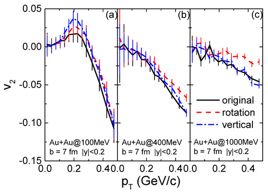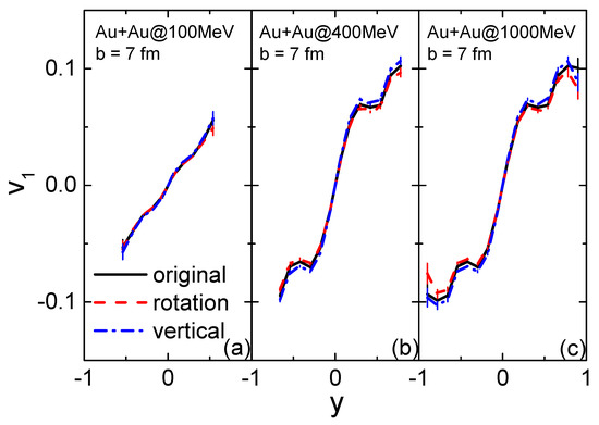 For all results from Figure 5, Figure 6, Figure 7 and Figure 8, the difference among results from different collision prescriptions increases with increasing collision energy. This is expected since the Pauli blocking becomes less important and there are more successful nucleon–nucleon collisions at higher collision energies. This also shows the importance of properly incorporating the angular momentum conservation in the simulation of heavy-ion collisions at higher energies.