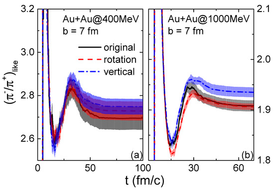 Figure 10 compares the time evolutions of the ratio from three collision prescriptions at different collision energies. While the ratios are similar at AMeV from different prescriptions within statistical error, the “vertical” prescription leads to a ratio which is about larger than those from the other two prescriptions at AMeV. The effect is smaller than that from the symmetry energy [20,21] but not negligible. The larger ratio from the “vertical” prescription is likely due to the stronger suppression on the channel as a result of less protons in the high-density region compared with other prescriptions with smaller as shown in Figure 2b.