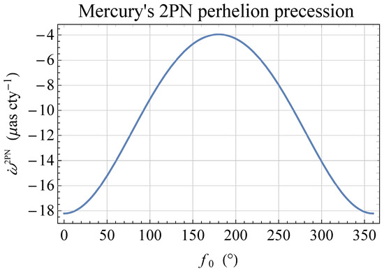 It should be recalled that Equation (1) does not come only from the direct3 effect of the 2PN acceleration entering the equation of motion (see, e.g., [22] eq. (38), p. 8). Indeed, also two indirect, or mixed, effects related to the 1PN acceleration (see, e.g., [22] eq. (37), p. 7) subtly concur to yield the net shift per orbit to the 2PN level from which (a part of) the precession follows by dividing it by the (Keplerian) orbital period ; see [34] for how to calculate such indirect effects in a different scenario. They are due to the following facts. On the one hand, during an orbital revolution, all the orbital elements entering the right hand side of the Gauss equation for [35], calculated with , in principle, undergo instantaneous variations due to itself changing their values with respect to their fixed Keplerian ones referred to some reference epoch . On the other hand, when the integration over f is performed calculating , the fact that the true anomaly is reckoned from a generally varying line of apsides because of should be taken into account as well. Such features yield two additional corrections to with respect to the usual 1PN one4