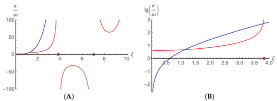 Model of Localized Vortices. Left panel (A): Both axes are in linear scale. Right panel (B): Vertical axis is in log-scale. Both panels (A,B): A structure with three vortices forms only when , where , l is the radius of a circumscribed circle, , is the parameter characterizing the “rapidity” of increase in temperature with distance from the disk rotation axis, is the coefficient of thermal expansion, is the angular velocity of rotation of the vortex structure, is the angular velocity of rotation of the accretion disk, and is the characteristic intensity of one localized vortex. The blue curve is for (the disk periphery is hotter). The red curve is for (the disk periphery is cooler): intensity as (red dot) at which the Bessel function . (Here ).