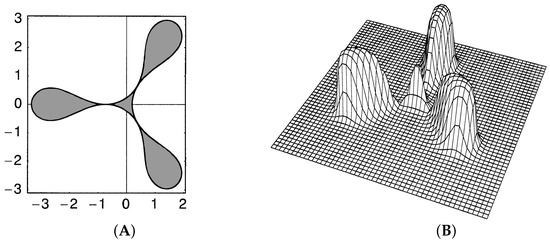 Illustration of analysis via method of thermo-vorticial spots (“blobs”). Left panel (A): A three-petal vorticity distribution is specified as , where vorticity is constant and function is two-dimensional Heaviside step-function equal to one inside the shaded domain and zero outside. (Ref. [22] explains in detail the entire theory and methodology. This depicted three-petal thermo-vorticial structure takes this particular shape when one of the guiding parameters of the macro-configuration reaches its limit case.) Right Panel (B): For the vorticity distribution specified in Panel (A), the resulting temperature distribution is obtained per Equation (28). The unit along the vertical axis is the characteristic magnitude of temperature excess . (The central peak is a consequence of the vorticity parametrization for the geophysical application in Ref. [22], which for a black hole accretion disk should be obviously nil.) Both Panels (A,B): For x and y axes, the unit is ; is the angular velocity of rotation of the vortex structure as a whole; is the characteristic angular velocity of rotation of the accretion disk; and . In the expression for , the parameter (characterizing the “rapidity” of increase in temperature with distance from the disk rotation axis) may be estimated as . Here is the characteristic radius of the accretion disk (obviously not equal to R) is presumed to be greater than size of the macro-structure, and may be estimated as the temperature difference across the disk (from the periphery to the center). In the expression for , the parameter is the coefficient of thermal expansion, which (for the model whose equation of state is approximated by the equation for an ideal gas) may be written as , where is the averaged temperature of the accretion disk.