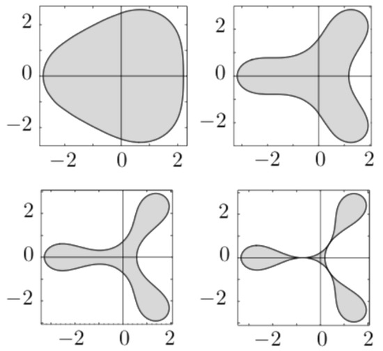 For quasi-2D flows in thin layers of ideal fluid, another fruitful approach to analysis also exists (for deeper insight, see, Refs. [18,22,23,24,25,26,27], and applications and references therein). This approach is called the contour dynamics method (CDM). The gist of the method is that the continuous hydrodynamical velocity distribution may be treated as a set of patches with movable boundaries (contours) and constant vorticity inside. As the underpinnings of the CDM show, such vortex-patch approximation correctly grasps the general tendency in the dynamics and evolution of large-scale flows when the large-scale motions are weakly sensitive to a fine structure in the hydrodynamical velocity field. The contours of the vortex structures within the CDM framework are determined by spatially one-dimensional integro-differential nonlinear equations. Equations of the contour dynamics—which describe the self-induced motion of the vorticity-discontinuity boundaries, or “contours”, in an inviscid, incompressible, two-dimensional fluid with piecewise constant vorticity distribution—may be effectively resolved by either numerical or analytical approaches. Figure 5 illustrates the variability of shapes that a symmetric stationary macro-structure may take, depending on one of its guiding parameters. The shape may range from a weakly deformed circle to a sharply pronounced three-petal “flower”. (Other parameters define how many petals appear: two, three, etc.)