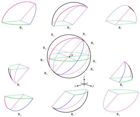 The three planes , and are invariant planes of system (19). Through Poincaré compactification [59], the infinite space can be closed to the finite, so the whole space can be regarded as a Poincaré ball. A Poincaré ball is divided by these three invariant planes into eight regions , as shown in Figure 1. The accurate representation of regions is