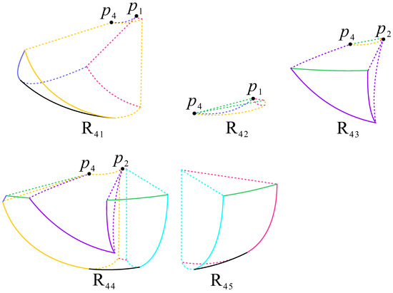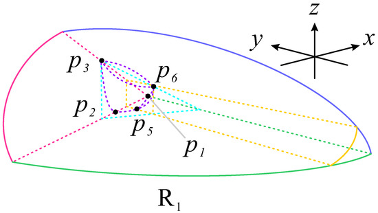 For subregion , its front and back are bounded by and , respectively, its bottom is limited by , and its left and right are restricted by and , respectively. The trajectories in monotonically decrease in the positive x axis, increase in the positive y and z axes, so the trajectories are from and go to .