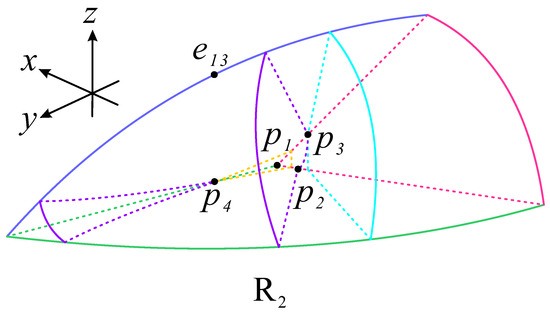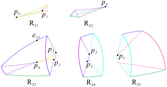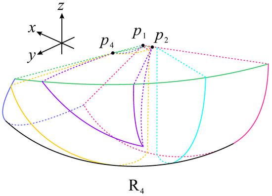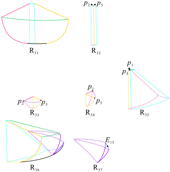 The back, left, right, lower, and front parts of subregion are bounded by the surface , the planes , , , and , respectively. The trajectories in monotonically decrease in the positive y axis and increase in the positive x and z axes. Hence, they come from subregions , , and the point and move towards .