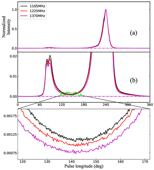 A large number of observations previously undertaken have indicated that the average radio pulse profile of PSR B0950+08 is composed of IP and MP components [1,2]. Hankins and Cordes [1] found, using the Arecibo telescope, that the average pulse profile of PSR B0950+08 involved obvious bridge emissions between the IP and the MP at 400 MHz. Cairns et al. [26], using the Parkes telescope, found the precursor component before MP was 400–1400 MHz. Recently, Bilous et al. [2] carried out multi-band observations of the pulsar using the NenuFAR and Westerbork Synthesis radio telescopes and found that there was a certain frequency dependence on the separation of the precursor from the MP and that the separation at low frequencies was larger than at high frequencies. In addition, the bridge emissions between the IP and MP varied with frequency and the intensity of emissions at lower frequencies was stronger than at high frequencies.