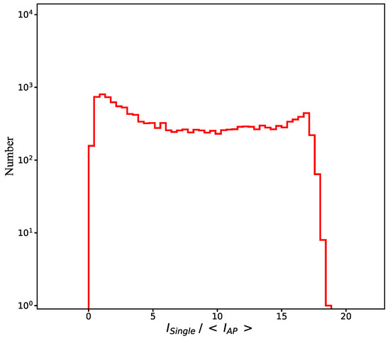 The distribution histogram of the pulse peak flux density. The peak flux density of each single-pulse () was normalized by the peak flux density of the average pulse profile ().