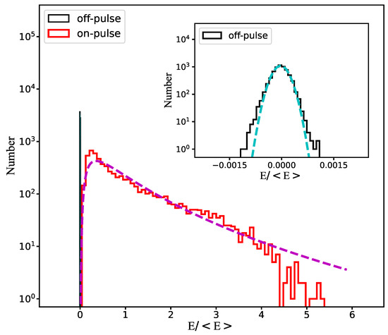 Figure 3 is the distribution of the relative peak flux density, and /, where is the peak flux density of each single pulse and is the peak flux density of the average pulse profile. It is obvious that the single pulse peak flux density of PSR B0950+08 is less than 20 times the average flux density across the entire on-pulse window. This is less than the peak flux intensity required to define a GP. Figure 4 is the distribution of the relative energy, , of 14,232 single pulses. Here, E is the energy of each single pulse and is the average energy of the whole on-pulse window. Obviously, E is less than six times , which does not meet the criteria for a GP. Moreover, the off-pulse region (solid black line) follows the expected normal distribution and the on-pulse region follows a log-normal distribution, with the magenta dashed line being the best-fitting curve. This indicates that the energy distribution is consistent with the normal pulse. Therefore, our observation did not detect a GP at PSR B0950+08.
